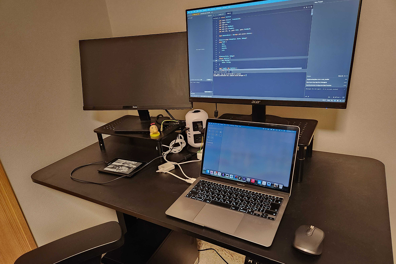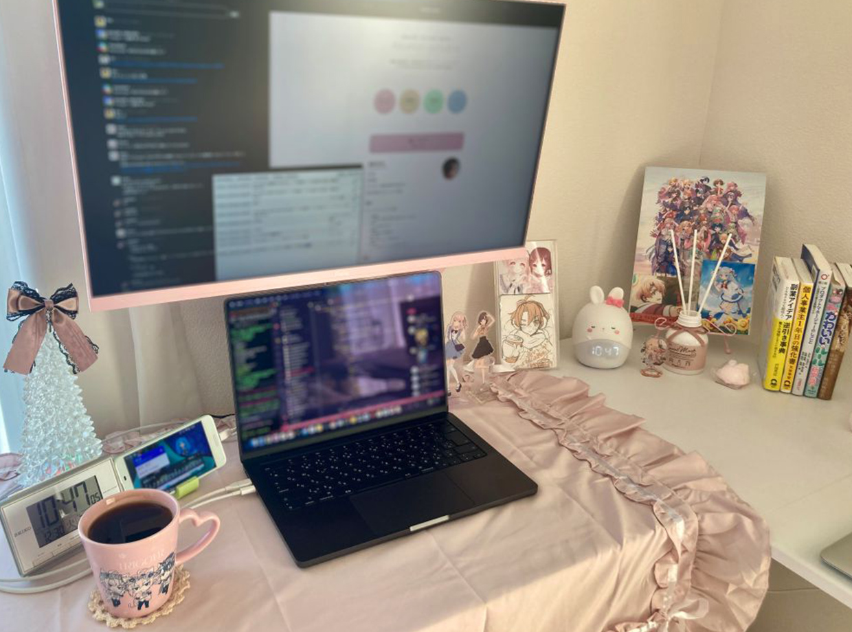 ・デスク:立ち作業しやすい電動昇降式 ・PC:MacBook Pro (M4 Pro) 会社支給 ・モニター:サイズ大きい、色域広いもの ・推したち:プロセカ、アイナナ、シルヴィア・ルミナスターシャさま ・ダッシュボード兼テスト用 Android:後の予定や天気を見れる ・書籍:マネジメント、個人事業など学んでいるもの