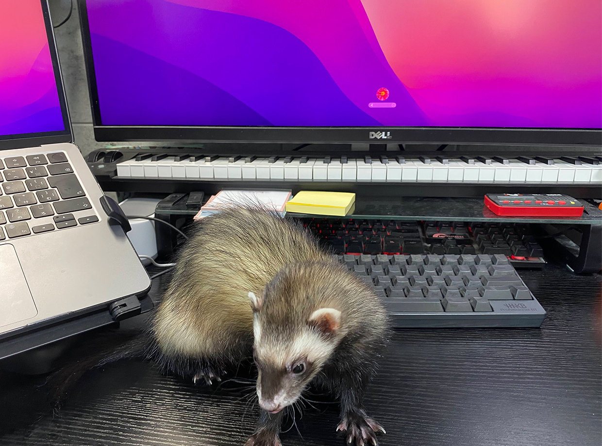 ・PC:Macbook Air(会社支給) ・キーボード:HHKB Professional BT PD-KB600BN ・マウス:Kensington ExpertMouse ワイヤレストラックボール K72359JP ・モニター:Dell U3415W ・マイク:audio technica AT2020 ・オーディオインターフェース:YAMAHA AG03 ・ルータ:BUFFALO AX5400 ・ハブ:HP ProCurve Switch 1800-24G ・足元にフェレット
