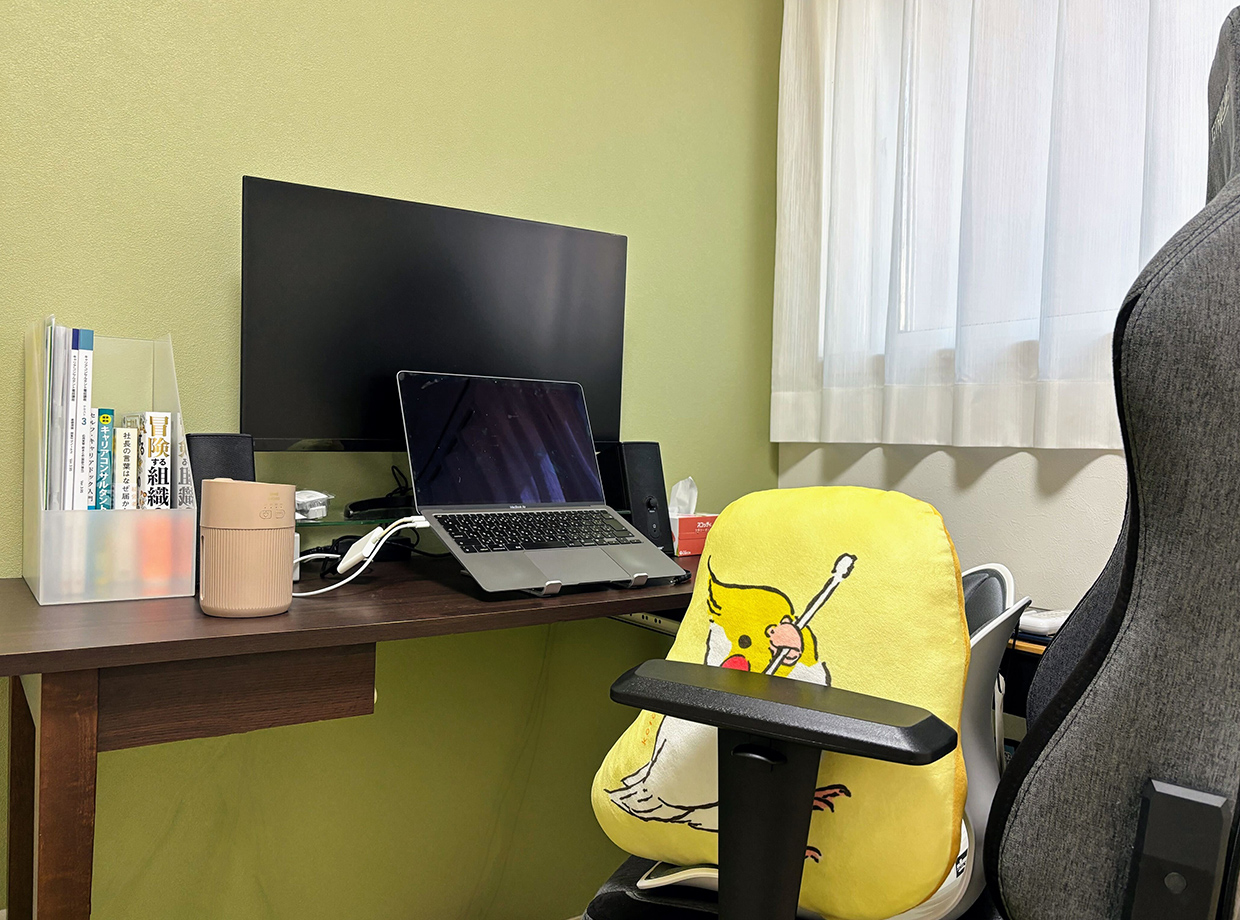 ・PC:MacBook Air (そろそろリニューアル対象なので楽しみです) ・モニター:おさがり ・PCスタンド:おさがり ・スピーカー:おさがり ・イス:GTRACING ・姿勢サポートチェア、加湿器、ハンドクリーム、仕事関連の本、資格関連の本・テキスト、クッション