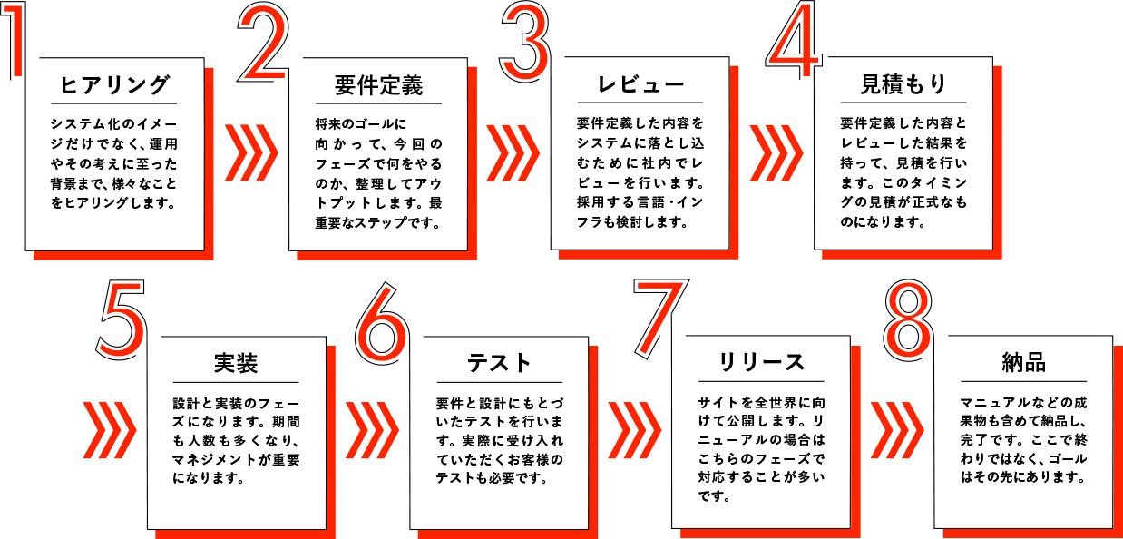 クラベスにおけるシステム開発は以下のようなステップが有ります。(※大小問わず実施されますが、規模が小さい場合には圧縮されるケースもあります。)