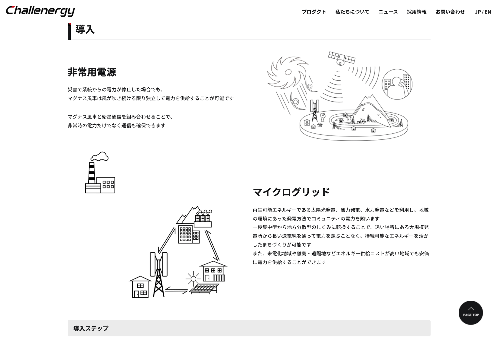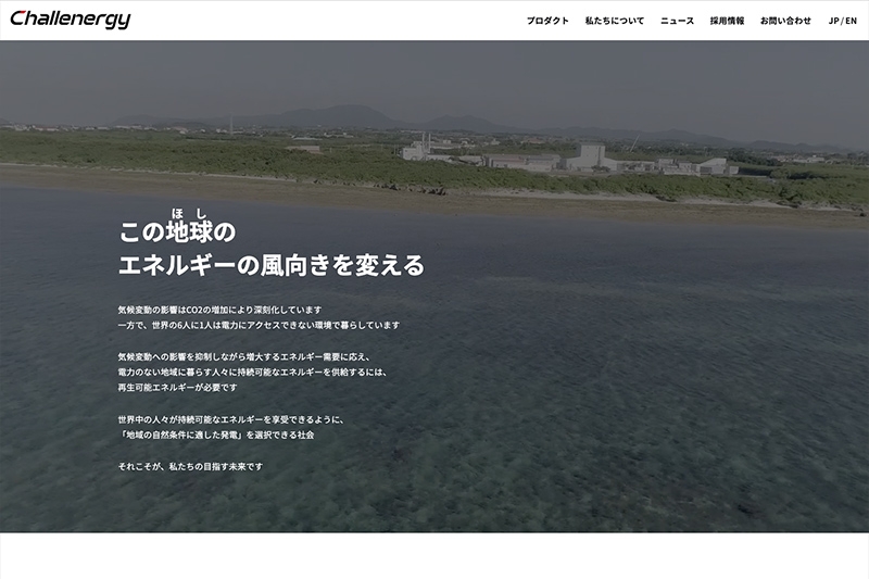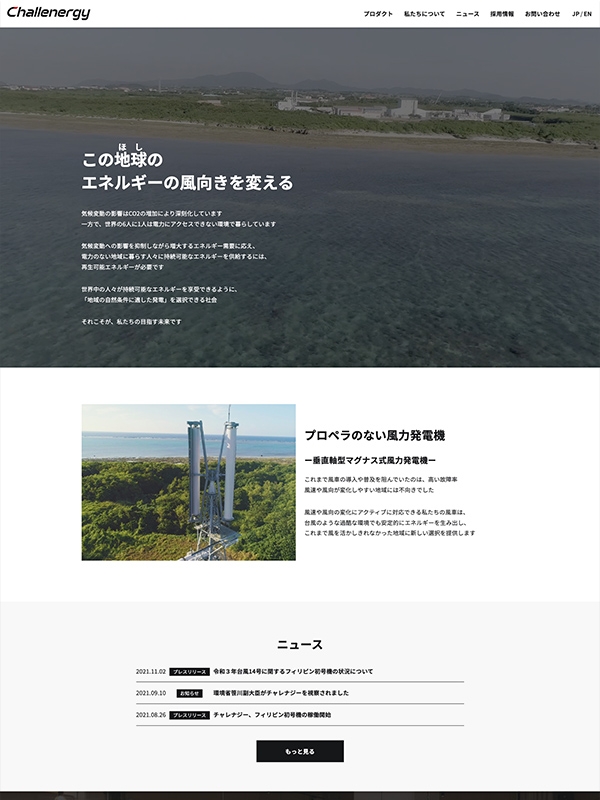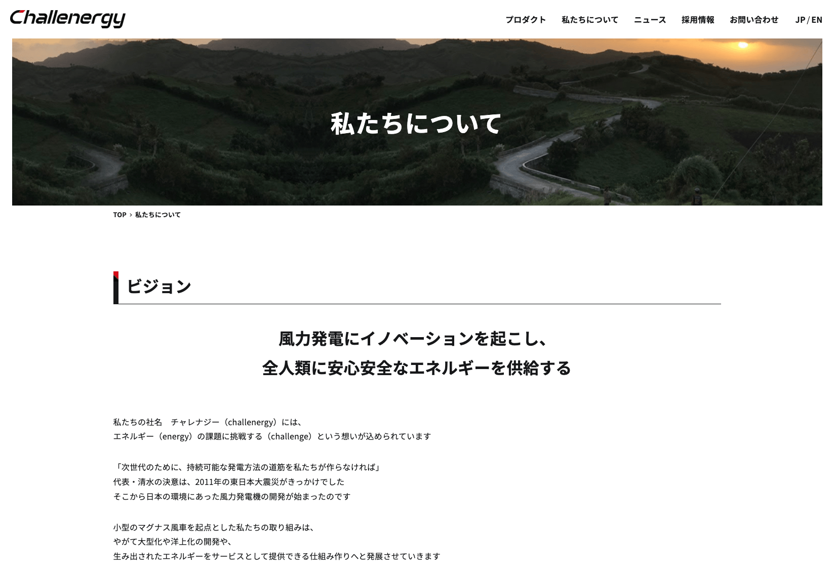 チャレナジー(challenergy)には、 エネルギー(energy)の課題に挑戦する(challenge)という想いが込められています。 「次世代のために、持続可能な発電方法の道筋を私たちが作らなければ」 清水代表は、2011年の東日本大震災をきっかけに決意されました。 そこから日本の環境にあった風力発電機の開発が始まったのです。 小型のマグナス風車を起点とした私たちの取り組みは、やがて大型化や洋上化の開発や、生み出されたエネルギーをサービスとして提供できる仕組み作りへと発展させていきます。 「風力発電にイノベーションを起こし、全人類に安心安全なエネルギーを供給する」をビジョンに掲げ、活動されています。