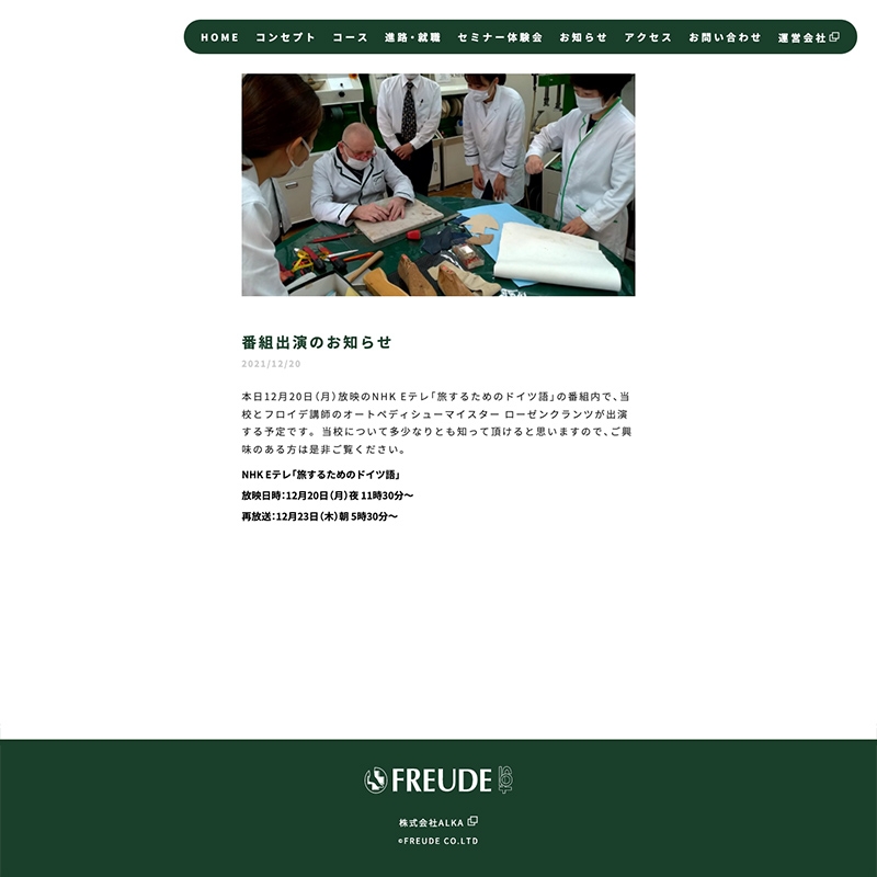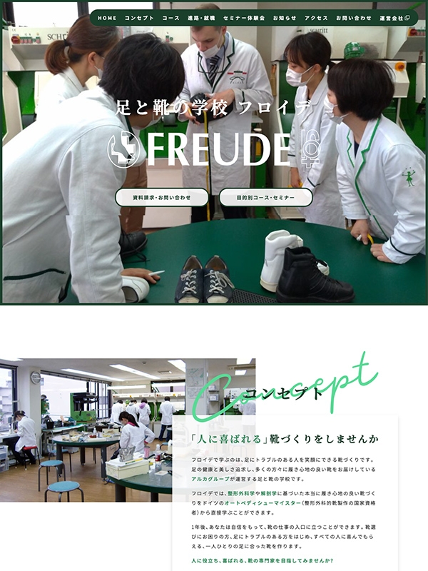 「足にトラブルがある方もない方も、全ての方に履 き心地がよい靴、歩きやすい靴をご提案できる人を育成する」というコンセプトのもと、オートペディシューマイスターの教育カリキュラムに則った靴作りのプロを育成する学校として、アルカ・グループが運営しています。 フロイデは、日本で唯一の本場ドイツの公立靴専門学校の姉妹校です。 ドイツや日本の第一線で活躍する講師陣により、本場のカリキュラムや工具を使った伝統のある技術を学ぶことができる学校です。