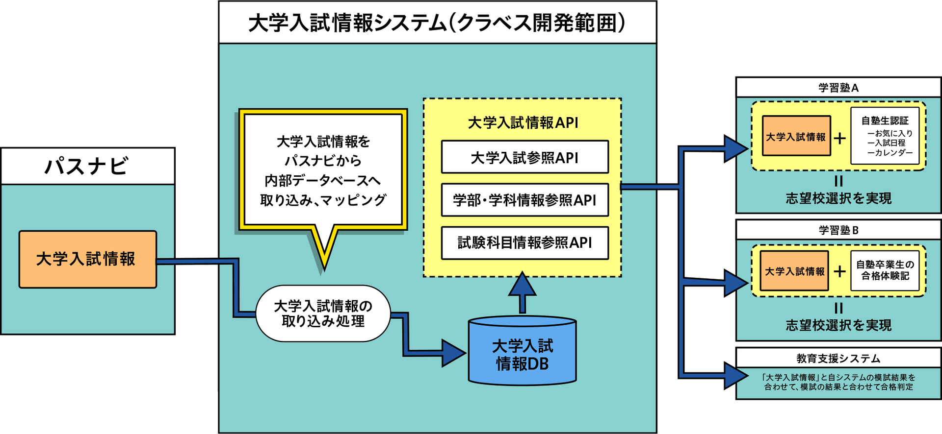 大学入試情報の提供はこれまで都度販売でしたが、継続的に販売できるようにしたい要望がありました。 学習塾や教育支援システムが大学入試情報を活用し、独自に進路指導を行えることを目指します。